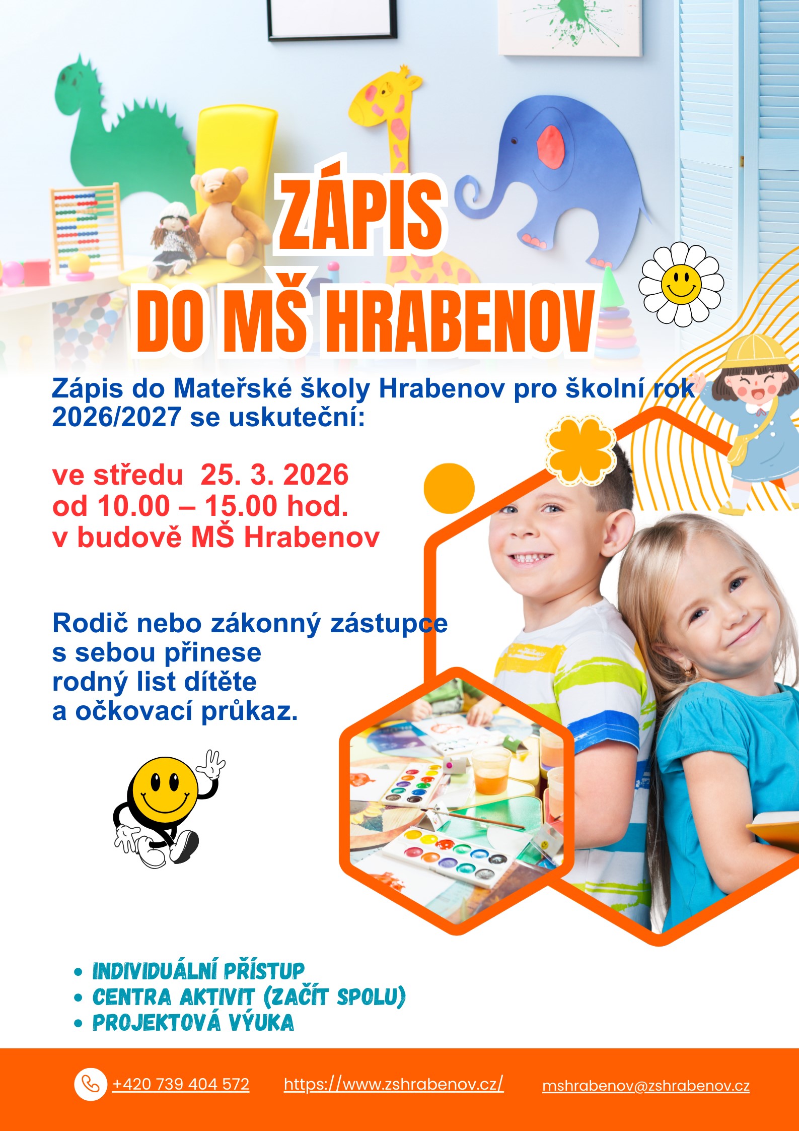 Zápis se uskuteční ve středu 25. března 2026 od 10:00 do 15:00 hodin v budově mateřské školy v Hrabenově.
